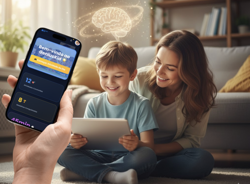 O GeniusKid é o primeiro app brasileiro que transforma o tempo de tela em desenvolvimento cognitivo mensurável e comprovado.